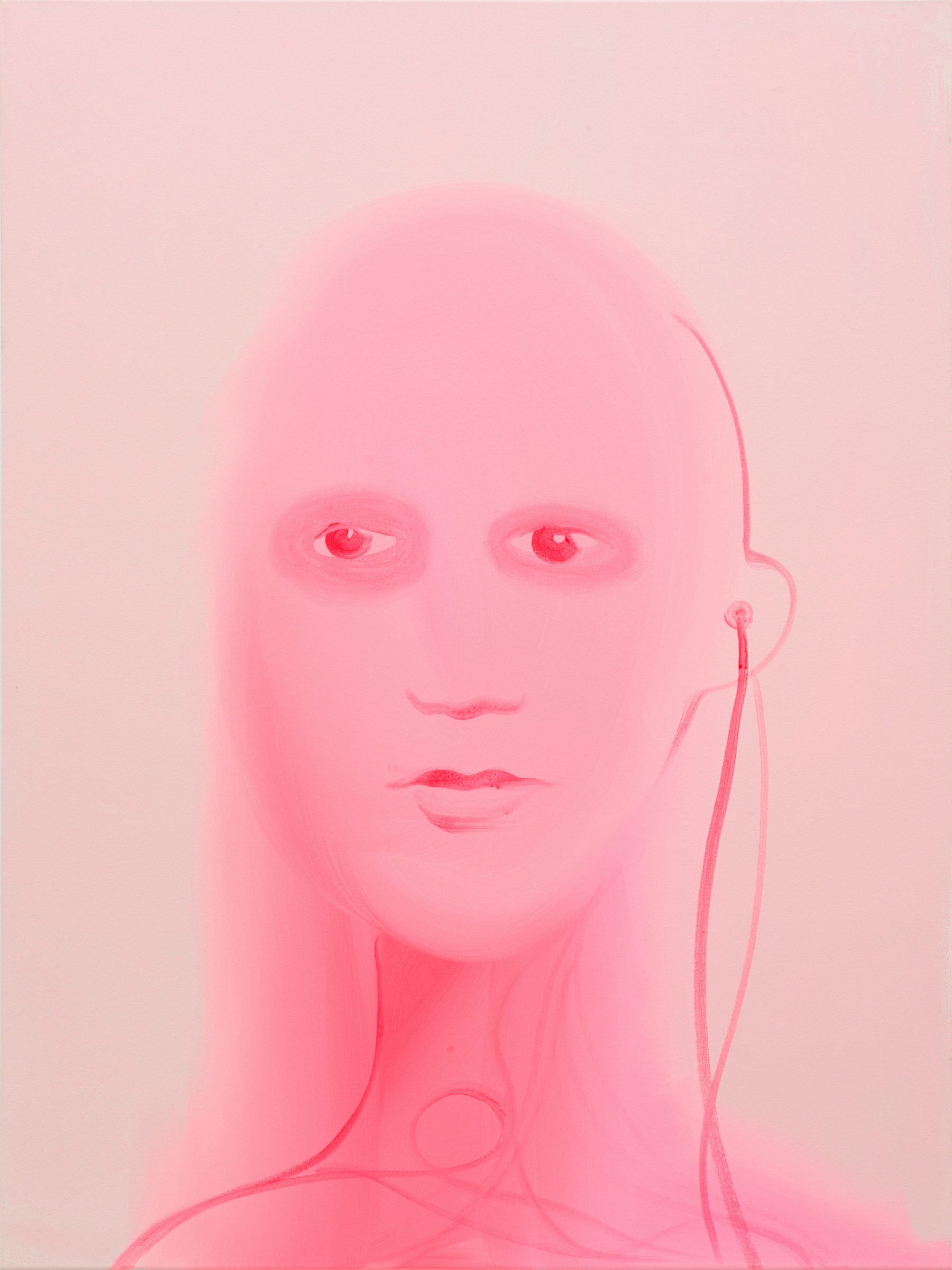 Closely tied to the AI theme is a robot painting called Createher Pink (2024). A visionary painter, Wanda’s engagement with AI and robotic imagery stretches back well over a decade, including her Face Time series. Gazing at this painting, I cannot help but think of Hari, the lead female character in Solaris, who is generated by the alien planet as a living replica of Kris Kelvin’s deceased wife, formed from how he remembers her. She is physical and tangible, yet not human—composed not of ordinary atoms, but of a neutrino-based substance, stabilized by Solaris’s invisible force: its magnetic field, which also happens to be the title of the current exhibition.