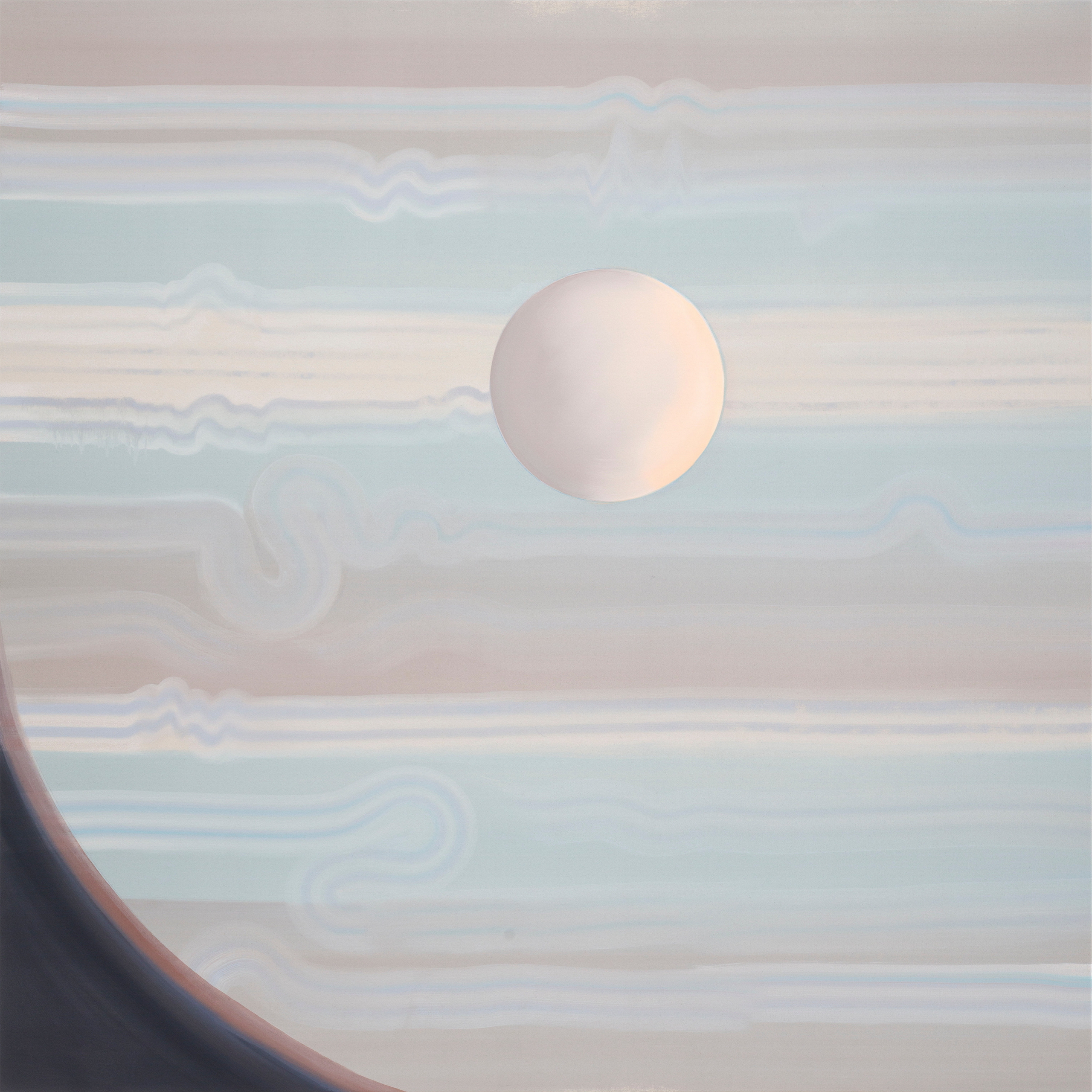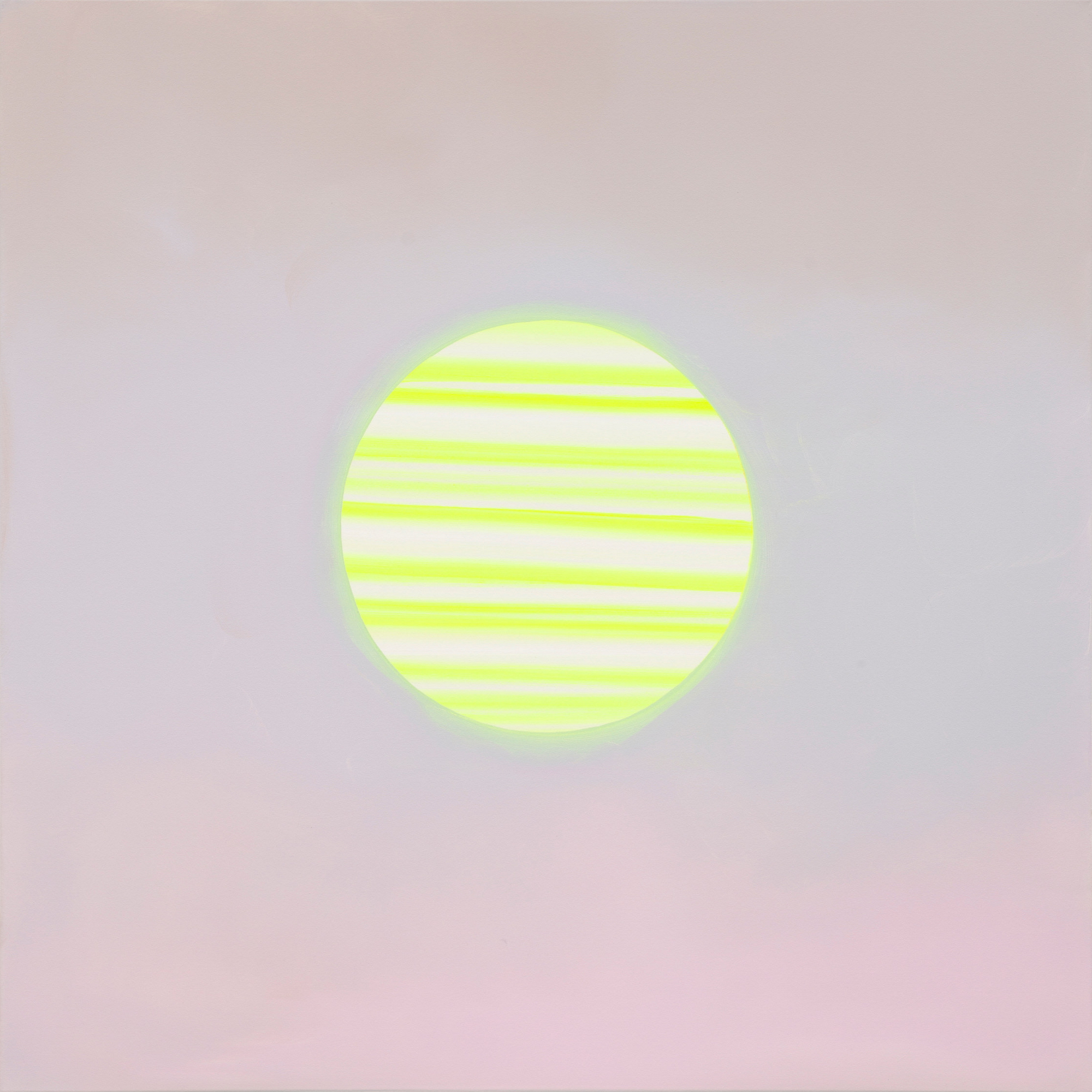 The first painting of the exhibition is Moonwalk #10 (2024). Striking fluorescent yellow bands form the moon, as if frequencies themselves were made visible, evoking the pulsing sensation of a rolling shutter scanning an ultra-bright light. While “moon” in the title could refer to ours—or any moon—it strikes me as closer in spirit to the arresting beauty of Jupiter, or perhaps some unknown celestial body. It resonates with the enigmatic imagery of the large painting in the next room, Untethered – Pale Blue (2025), and they poignantly recall the visual puzzles posed by Stanley Kubrick’s 1968 film 2001: A Space Odyssey.