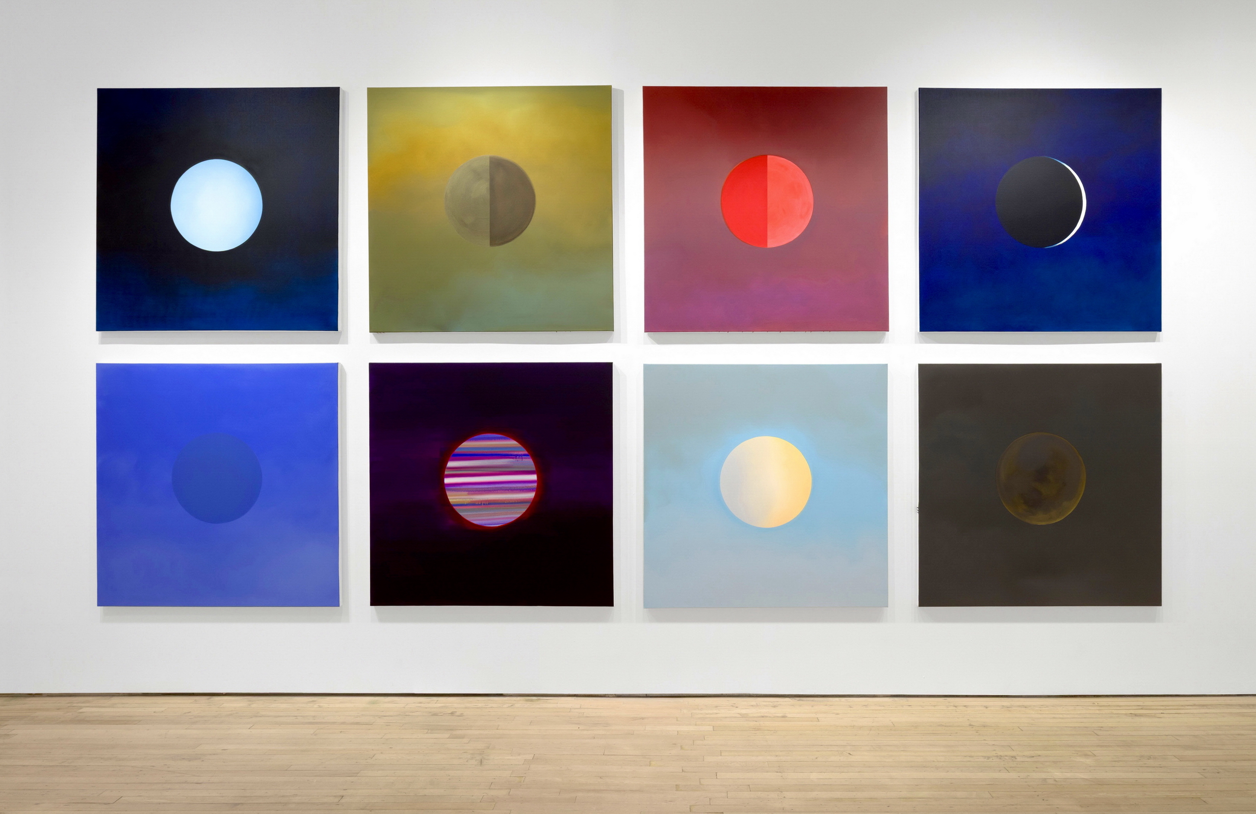 On the adjacent wall, eight more Moonwalk paintings are presented together, each a square canvas bearing the moon solemnly at its centre. Some lean toward the lifelike, dazzling in their beauty; others spring from the artist’s boundless imagination of celestial bodies and circular forms. Metallic pigments are occasionally infused, producing an astonishing visual effect. I feel they are no longer merely moons in the literal sense. Visually, they could be regarded entirely as abstractions. On a representational level, these pieces conjure realms of profound mystery: some evoke the imagery of the planet Solaris, with its vast, sentient ocean believed to possess high intelligence, and some, imbued with a futuristic quality, hint at portals or windows opening onto the unknown.
